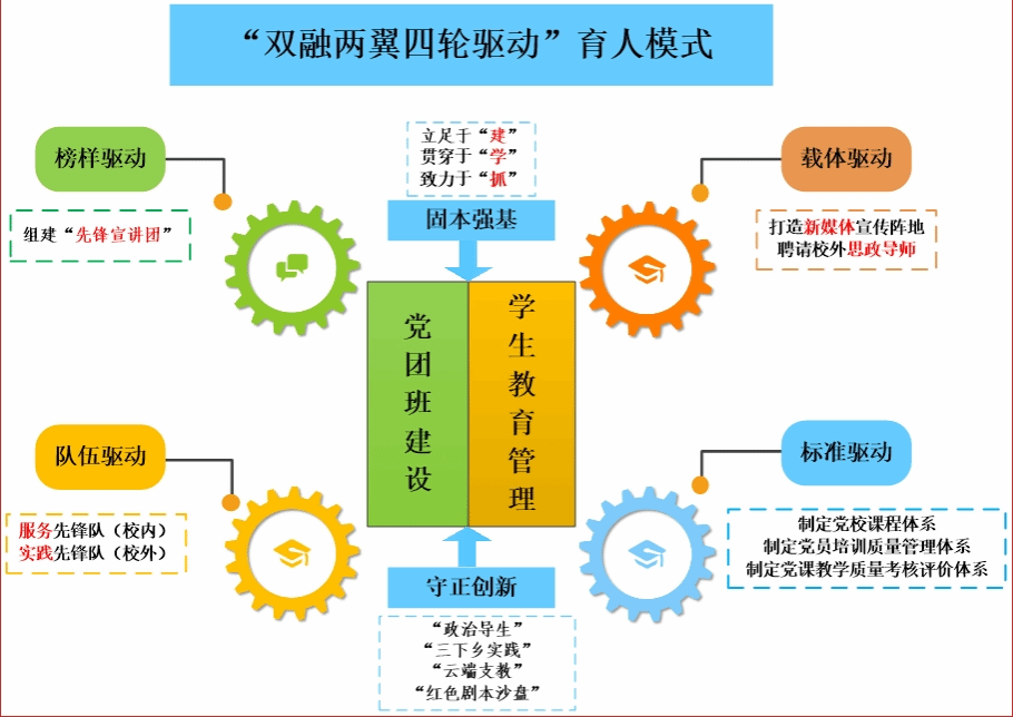 ——固本强基,全面加强学生思想心理建设。以理想信念教育为核心,聚焦“五育”全面发展,深化“三全育人”改革实践,构建“四位一体、五大工程、六维融合”的三全育人体系。设计打造心理辅导站,关注学生心理,开展有效干预,成功获批校级心理辅导示范站。